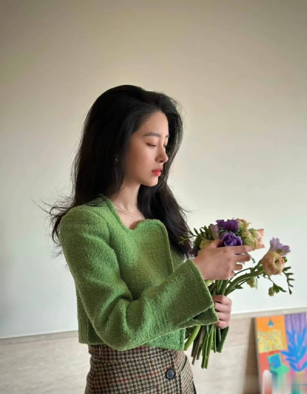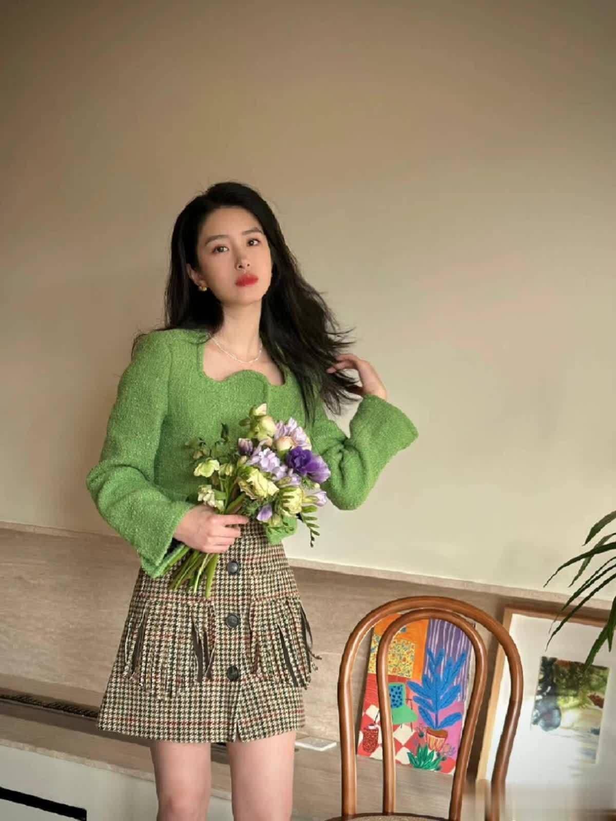 不得不说,杨采钰的衣品真的很好,明明都是很日常的单品,经她一组合,瞬间就穿出了那种 “看似不经意,实则很有品” 的高级贵气,她真的太懂如何把普通衣服穿出富家千金的松弛感了。这套搭配中,牛油果绿的短外套选得特别妙,这种低饱和度的嫩绿色一点都不会显黑,反而特别衬肤色,让人一看就觉得整个人清清爽爽的,版型刚好卡在腰上,视觉上直接把比例拉长,显得腿又细又长。