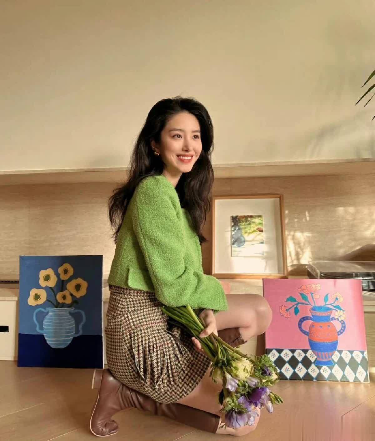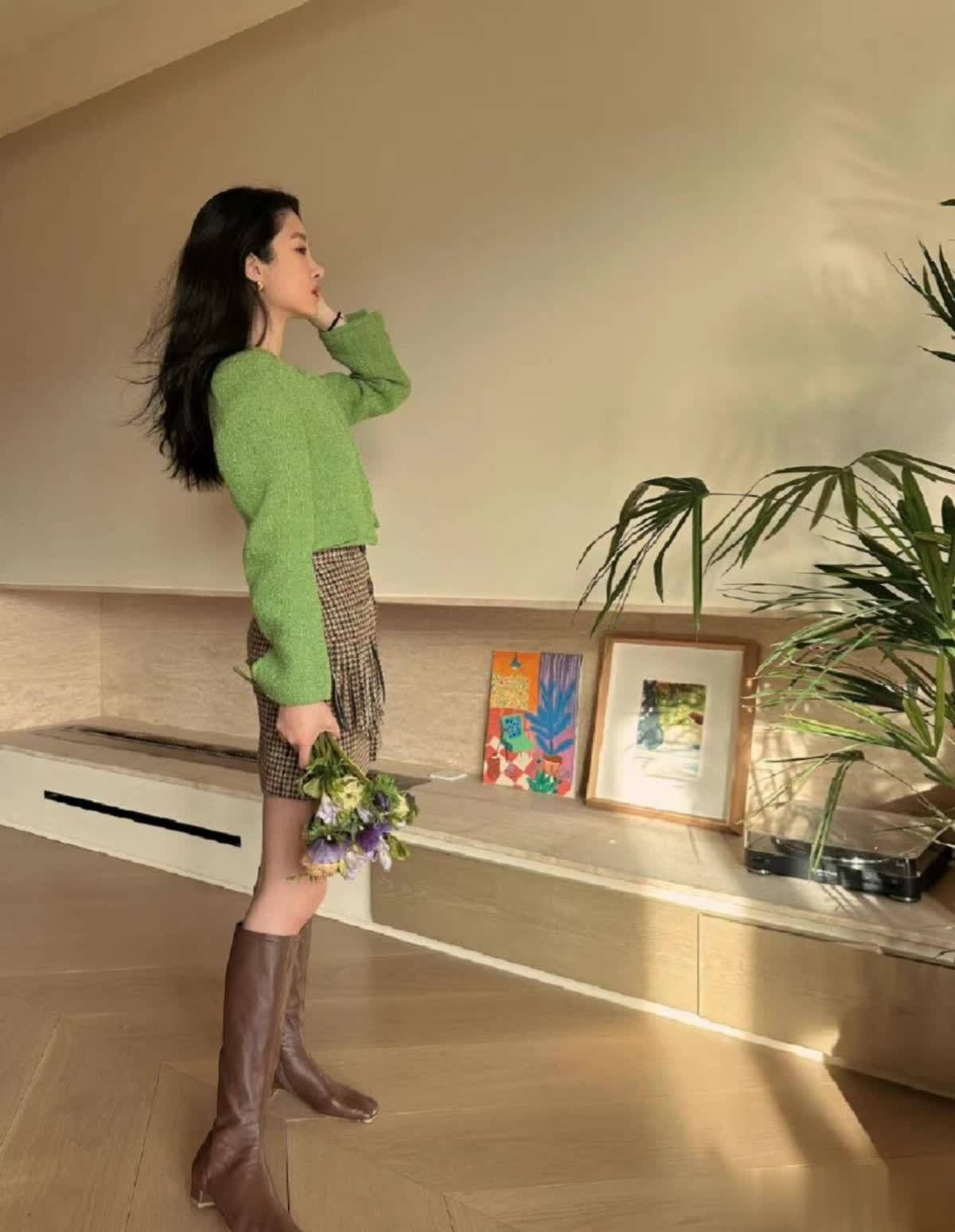 下半身的格纹半裙也很有心机,格纹元素自带复古滤镜,而裙摆处的流苏设计又多了一丝灵动,不会显得太死板。最绝的是搭配的这双棕色长靴,经典的方头设计自带复古滤镜,把腿修饰得笔直,整个人站在那里气质格外出众,手里拿着一束花,那种慵懒又精致的感觉,真的太戳人了。