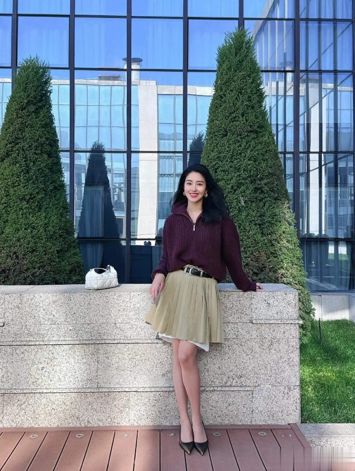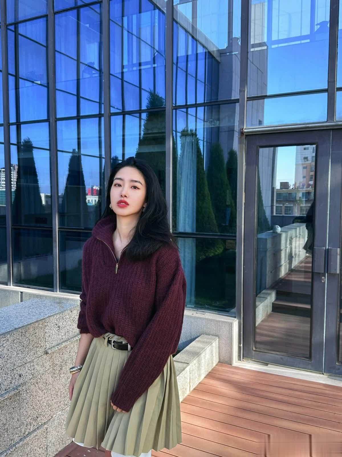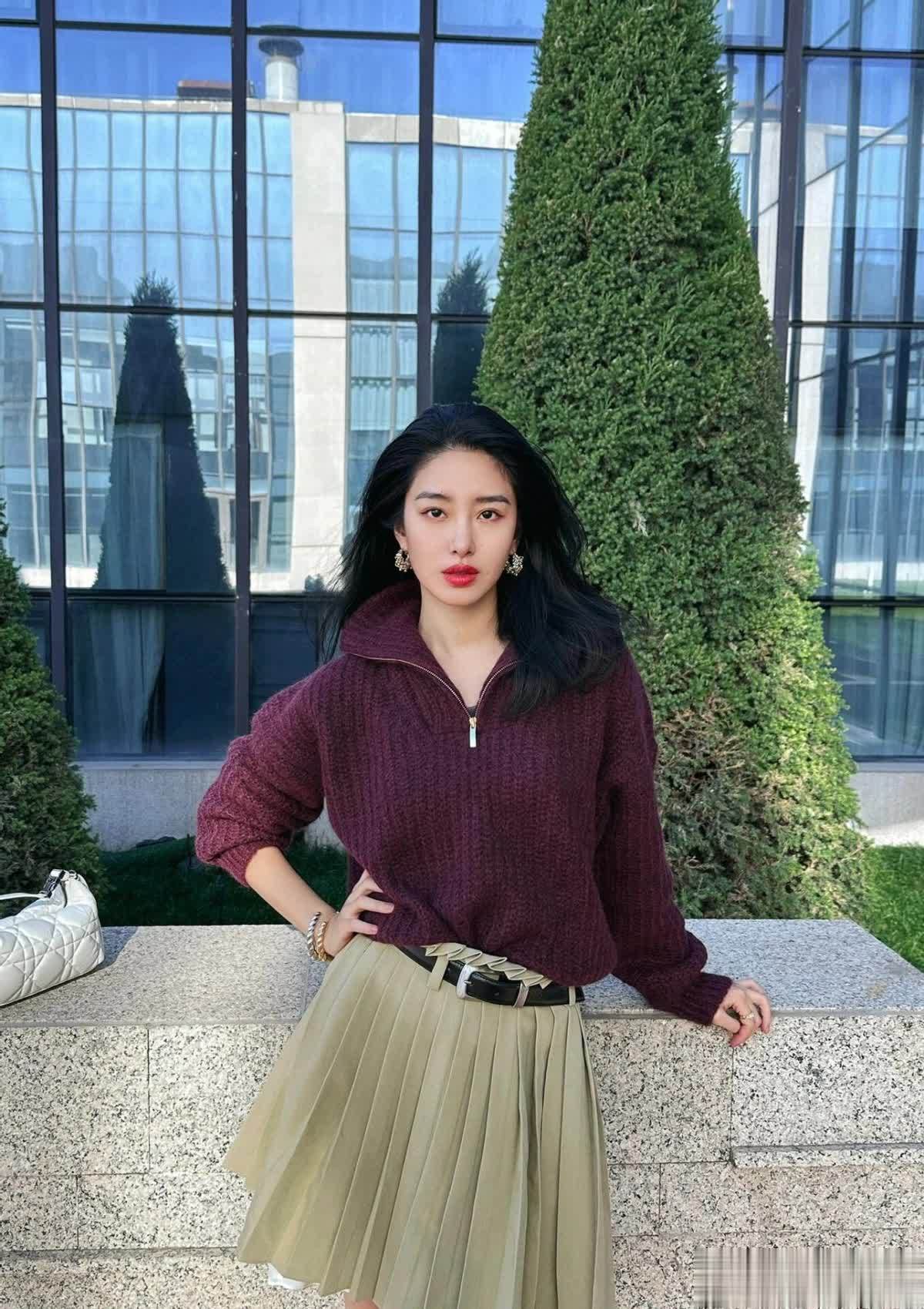 这一身毛衣和百褶裙的配色堪称 “显贵教科书”,葡萄紫的半高领毛衣颜色浓郁又温柔,自带一种贵气滤镜。半高领的设计刚好露出一截纤细的颈部线条,显得人很轻盈,毛衣的版型也是那种宽松的落肩毛衣,穿起来毫无束缚感,慵懒感拉满。