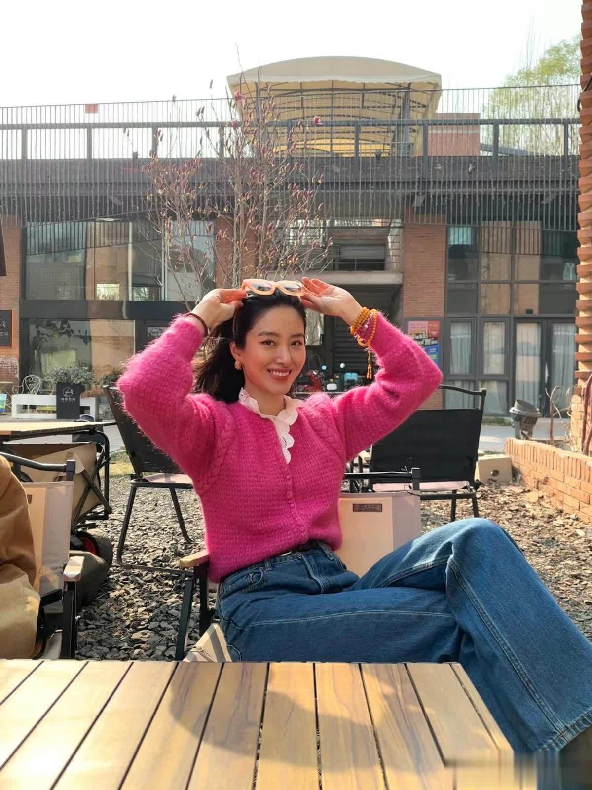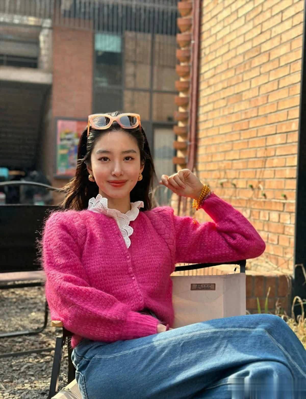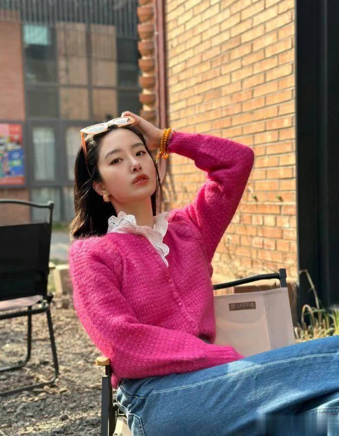 先看这件亮粉色针织开衫,它是整个造型的灵魂,杨采钰选的这件开衫,不是那种廉价的腈纶面料,而是带着明显毛绒感的羊毛混纺材质,摸上去软糯又蓬松,在阳光下泛着细腻的光泽,一看就质感不俗。亮粉色的饱和度拿捏得恰到好处,不是扎眼的荧光粉,是带着一点灰调的玫粉,既足够吸睛,又不会显得俗气。
